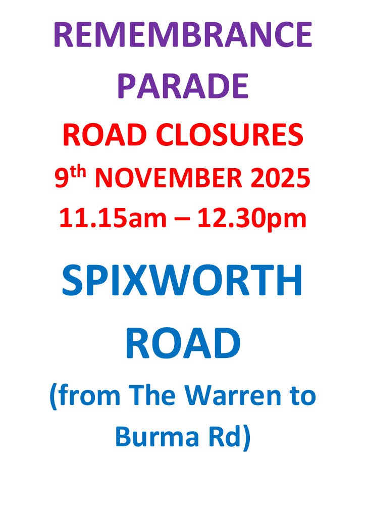 Remembrance Sunday November 9th Road Closure - Spixworth Road