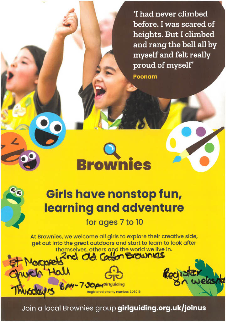 Brownies meet on Thursday at St. Margaret's Church Hall; 18:00hrs