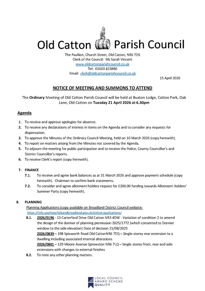 To view full Agenda go to https://www.oldcattonparishcouncil.co.uk/i-want-to/read-the-latest-minutes-agendas.html