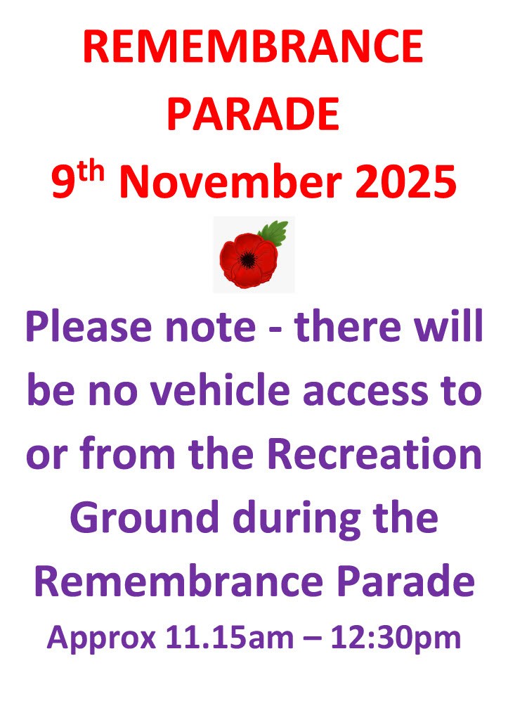 Remembrance Sunday November 9th Road Closure - Recreation Ground