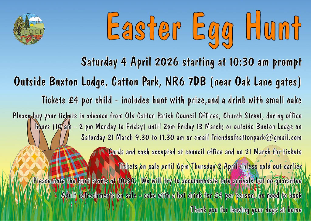 Easter Egg Hunt Saturday April 4th 2026, meeting outside Buxton Lodge at 10:30am https://www.oldcattonparishcouncil.co.uk/images/2026/April_4th_2026.jpg Easter Egg Hunt Saturday April 4th 2026, meeting outside Buxton Lodge at 10:30am